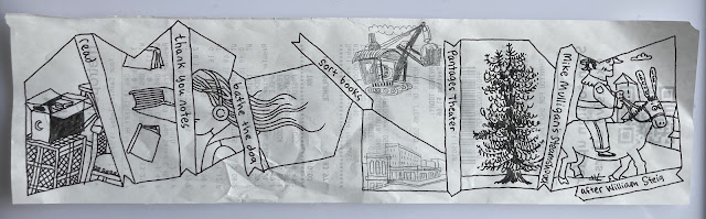 Some working drawings for Crow Commute. I spent all of 2020 developing the concept and then the draft drawings for this project. I turned in a mockup of all 22 panels in December of that year. I had originally thought I'd do a lot of research for the project at museums, but museums were closed. So instead I drove around the city and drew, I conducted phone interviews and watched youtube videos. I am most grateful for being forced out of my shell to interview people and collect primary source information. It was really interesting and heartwarming to talk to people who have shaped the last 50 years of Seattle history, and being a shy person, I probably would have avoided this work if I could have gone to museums instead! But I think those primary sources made Crow Commute a lot sharper as people's history. I was very insulated from the ravages of the pandemic in that I had a job already lined up, and was able to to complete it within the constraints of Covid. I know so many people who lost jobs and were left at loose ends. The older I get, the fewer answers I think I have, but the daily disaster of the 2nd Trump administration has me thinking about 2020 a lot.